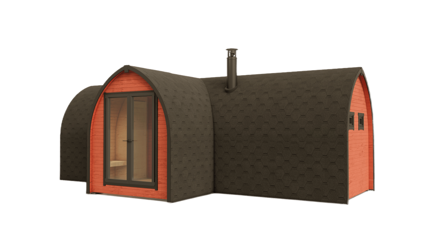 Баня Викинг 8м состоит из пяти помещений: парилки, комнаты отдыха, моечного отделения, туалета и бойлерной. Опционально добавляется крыльцо (предбанник). Поставляется в собранном виде (два модуля собираются на производстве и стыкуются на участке).